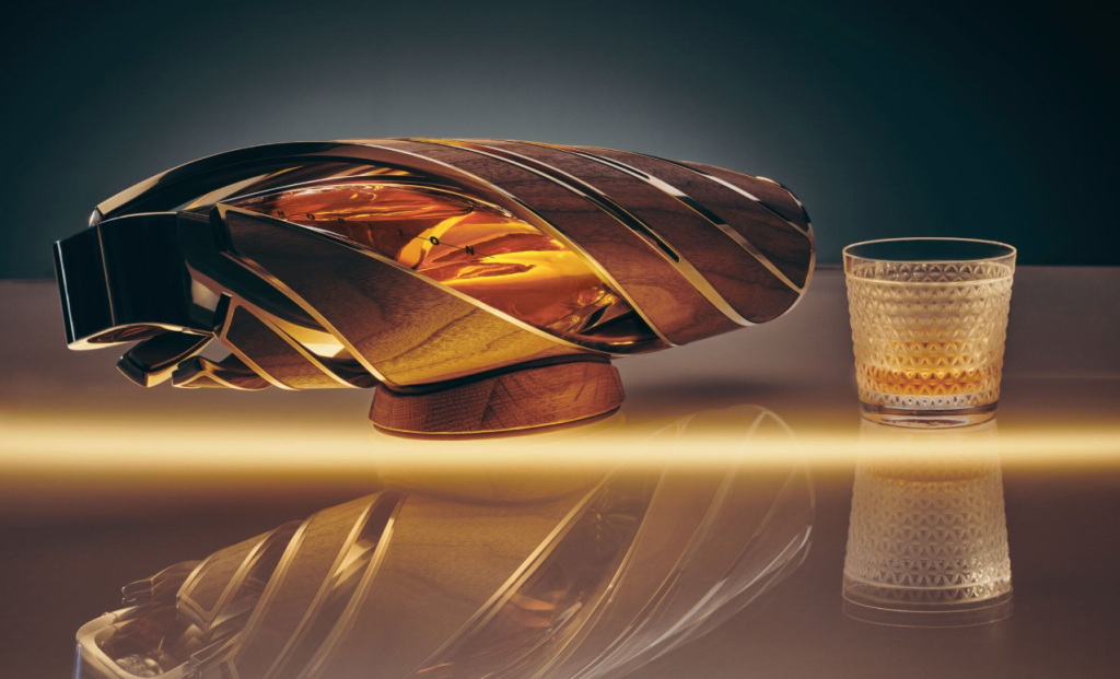 The bottle materials are an exercise in sustainable design. Inspired by the Six Pillars – the foundation stones of The Macallan that account for its distinctive single malt whiskies – the Horizon incorporates six upcycled, repurposed or ethically sourced materials integral to one or both brands. The glass, a material intrinsic to The Macallan and Bentley, is enveloped in a precision- engineered aluminium ribbon – recovered from the Bentley manufacturing process – that recalls the foundation and bodywork of a Bentley car. A sculptural case protects it, lined with the finest chestnut-hued carbon- neutral leather from Scottish leather provider Bridge of Weir Leather, and held by a copper frame fashioned from recycled copper from the disused stills in the whisky maker’s former distillery. The closure is meticulously adorned with an inlay of oak, sourced from one of the six casks used in the maturation of the whisky, with aesthetics inspired by the Bentley Drive Dynamic Control rotary dial. Adding a touch of refinement, the entire presentation is capped off with Bentley’s Crown Cut Walnut veneer, a specification developed for its vehicles. When one wants to drink from the bottle, it is twisted out of its arty enclosure, the aluminium overcap slid off, and the cap unscrewed for pouring.