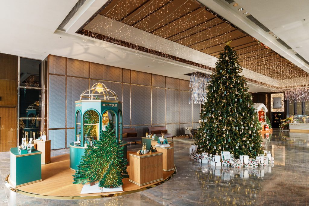 The festive atmosphere begins on the 9th-floor lobby. In collaboration with Maison Diptyque, the hotel avoids overly lavish decorations and instead creates a gentle holiday cadence through scent and light. From a 16-foot Christmas tree adorned with ten Diptyque holiday ornaments to a handcrafted Outpost Cabin, the space becomes an invitation to slow down.