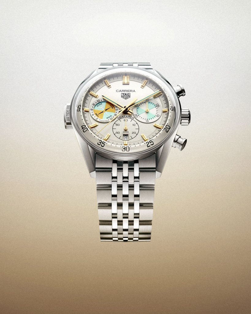 Tag Heuer revived its Seafarer maritime chronograph, reimagining it as a modern Carrera “Glassbox.” Measuring 42mm in steel, the new Carrera Seafarer remains faithful to the 1949 Seafarer tide watch that it draws inspiration from, with its champagne dial and Intrepid Teal accents, named after 1967 America’s Cup-winning yacht that inspired Jack Heuer’s original Skipper. Powering the watch is the TH20-04 automatic movement, which expands upon the foundation of the TH20-00 with a tide indicator that takes the place of its 12-hour counter. Set via a dedicated pusher at nine o’clock, the rotating tide disc completes one full rotation every 29.53125 days, accurately tracking lunar cycles and indicating optimal tidal conditions.