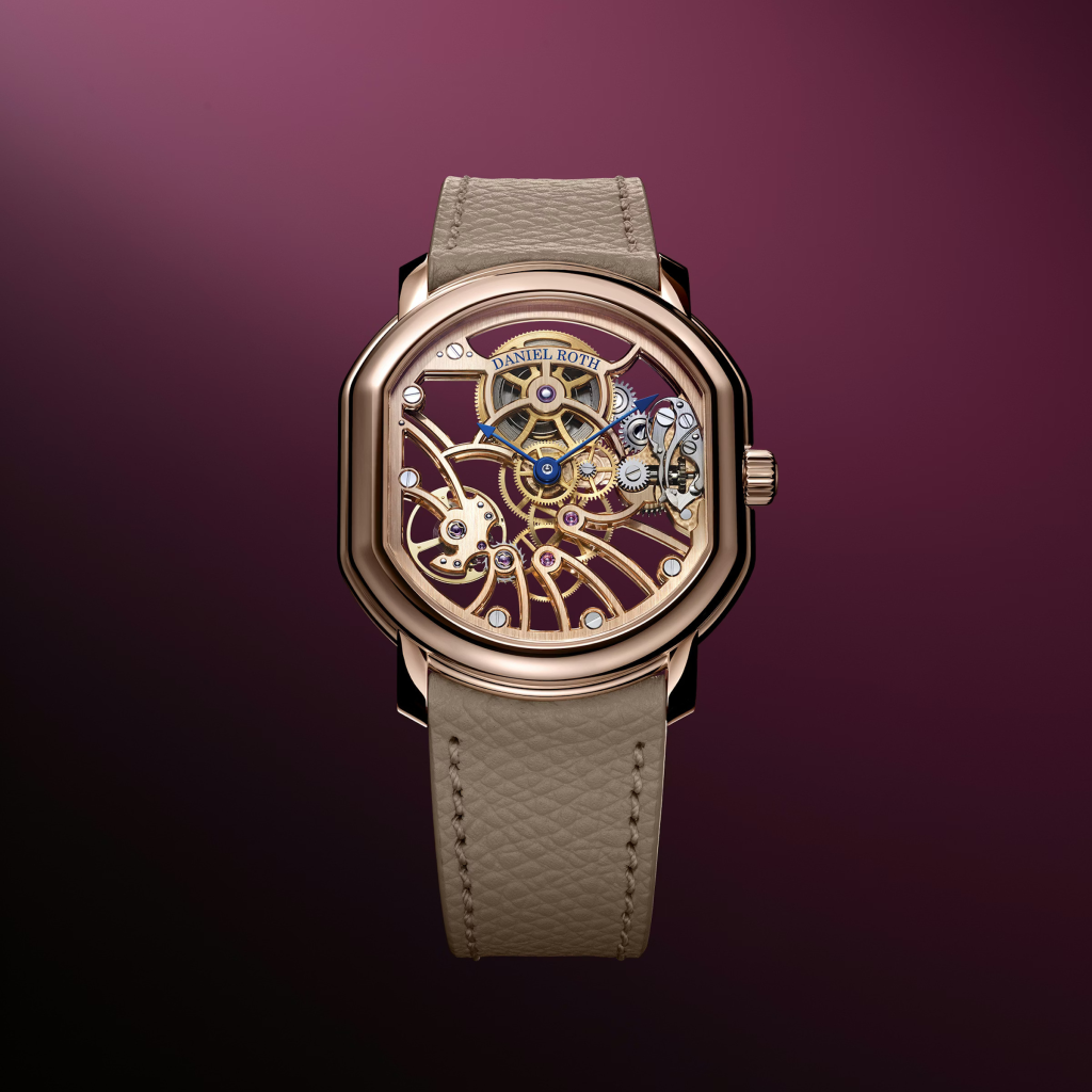Last year, Daniel Roth introduced the Extra Plat Souscription, a spectacular, extra-thin gold dress watch with a sophisticated guilloché dial. In the new Daniel Roth Extra Plat Rose Gold Skeleton, LV – and its in-house watchmaking arm, La Fabrique du Temps – imagines the Extra Plat in an openworked version in which the movement’s beauty is revealed in full. Said movement, the hand-wound calibre DR002SR, was developed specifically for this watch, featuring freshly designed bridges and plates crafted in 18k 5N rose gold that matches the watch’s double-ellipse case – a signature of the Daniel Roth maison. And although there are no hour markers, telling time is easy thanks to a set of arrow-tipped blue hands.