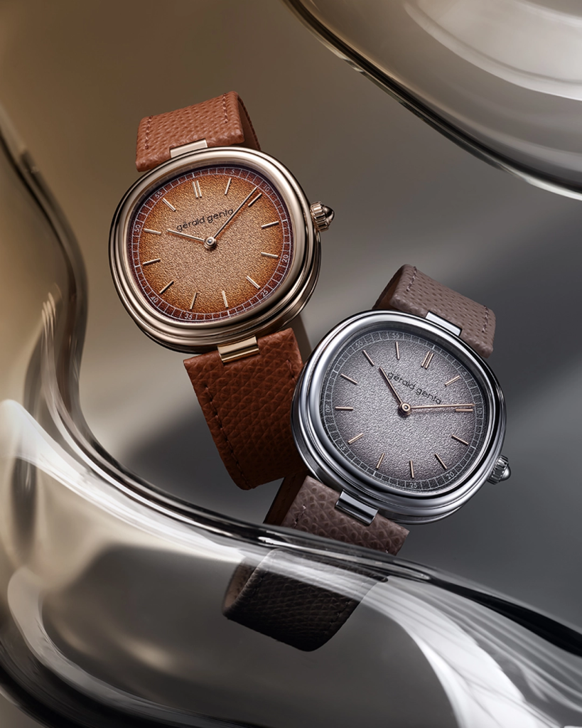 The new Gérald Genta Geneva Time-Only takes the design of last year’s Geneva Minute Repeater and tones it down with a time-only movement. Measuring just 8.15mm and driven by the Zenith Elite cal. GG-005P automatic movement, the watch is offered in two variants: the Marrone, rendered in a warm 18k rose gold 4N with a brown gradient grained brass dial and brown calfskin strap; and Grafite, which delivers a cooler metallic presence in white gold paired with a silver-shaded grained brass dial and grey calfskin strap. Subtle yet thoughtful details elevate both watches, including the refined, smaller 38mm diameter cushion-shaped case; and a single, broader and shorter lug on each side of the case replacing the traditional pair. Turning the watches over reveals the calibre GG-005P, Gerald Genta’s branded take on the ultra-thin Zenith Elite automatic, visible through a transparent caseback. The movement keeps a 50-hour power reserve and beats at 4Hz.