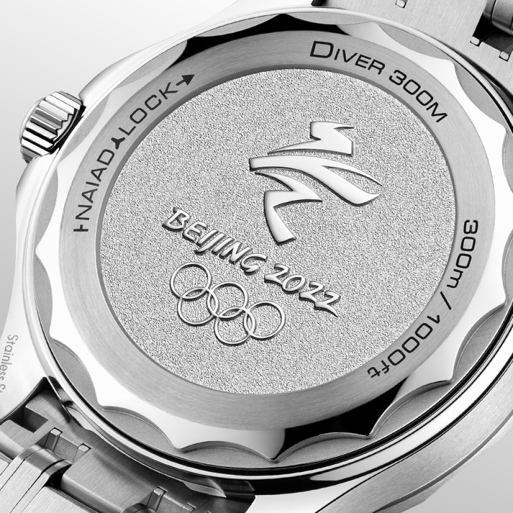 The 42mm stainless steel case is framed by a grade-5 titanium bezel featuring a 60-minute diving scale in raised numbering. Flipping the watch over, collectors will appreciate another commemoration to the winter games with the emblem of Beijing 2022 and the Olympic rings engraved on a closed case back.