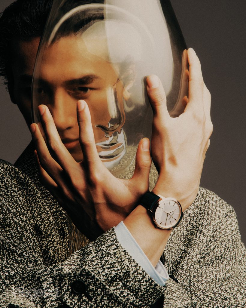 Patrimony Self-Winding 40mm watch in pink gold _Vacheron Constantin, Multicolour poplin coat and blue shirt _ Gucci, Murana vase _ Venini