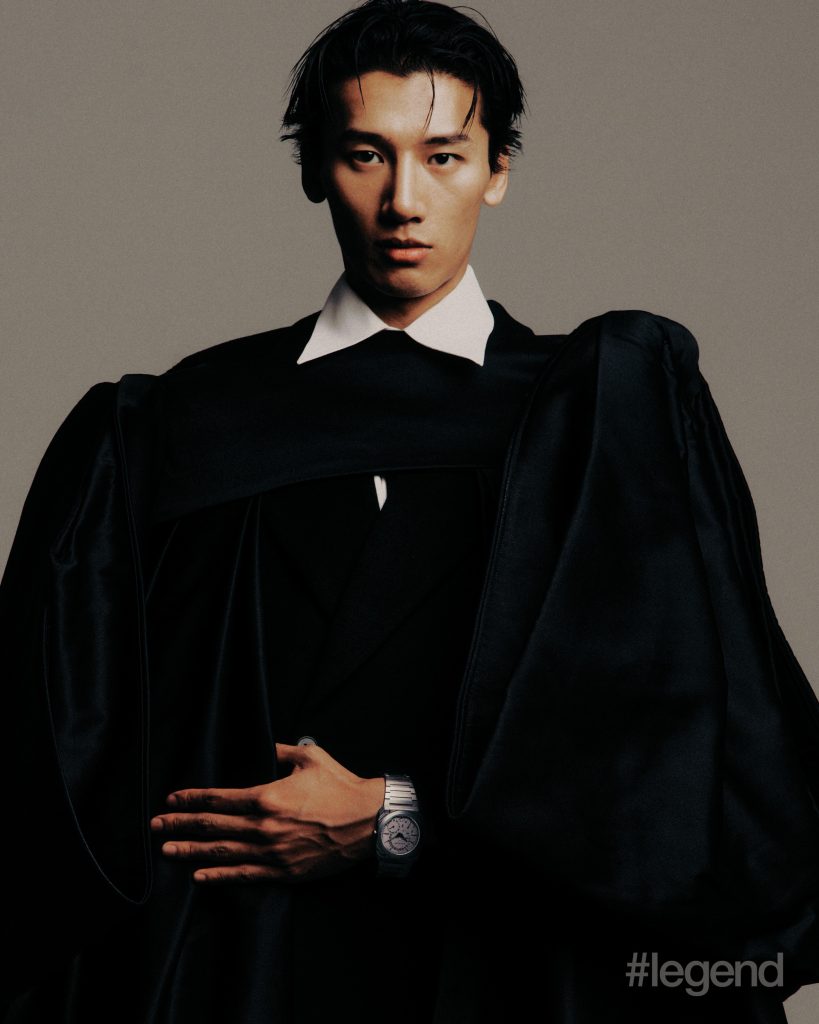Code 11.59 Perpetual Calendar watch in 18K white gold _ Audemars Piguet, Black double-breasted jacket _ Ferragamo, Patterned scarf _ Hermès