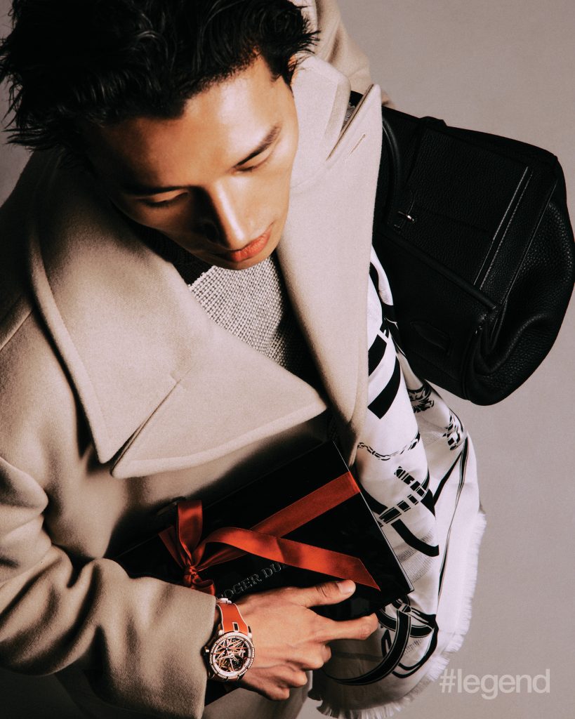Excalibur Monobalancier Blacklight watch in rose gold with red strap _ Roger Dubuis, Beige wool coat and sweater, black bag and patterned scarf _ Hermès