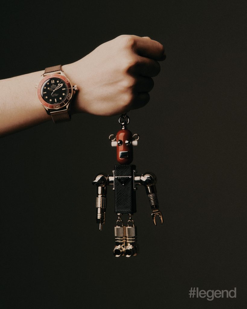 Seamaster Diver 300M 42mm watch in bronze gold _ Omega, Robot Saffiano leather keychain charm _ Prada
