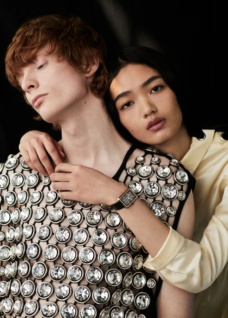 On Yuyu, BOY·FRIEND Couture watch in black-coated steel on black grosgain ribbon-pattern calfskin leather strap _ Chanel, Yellow dress _ Balenciaga; On Mason, Crystal embroidered top _ David Koma