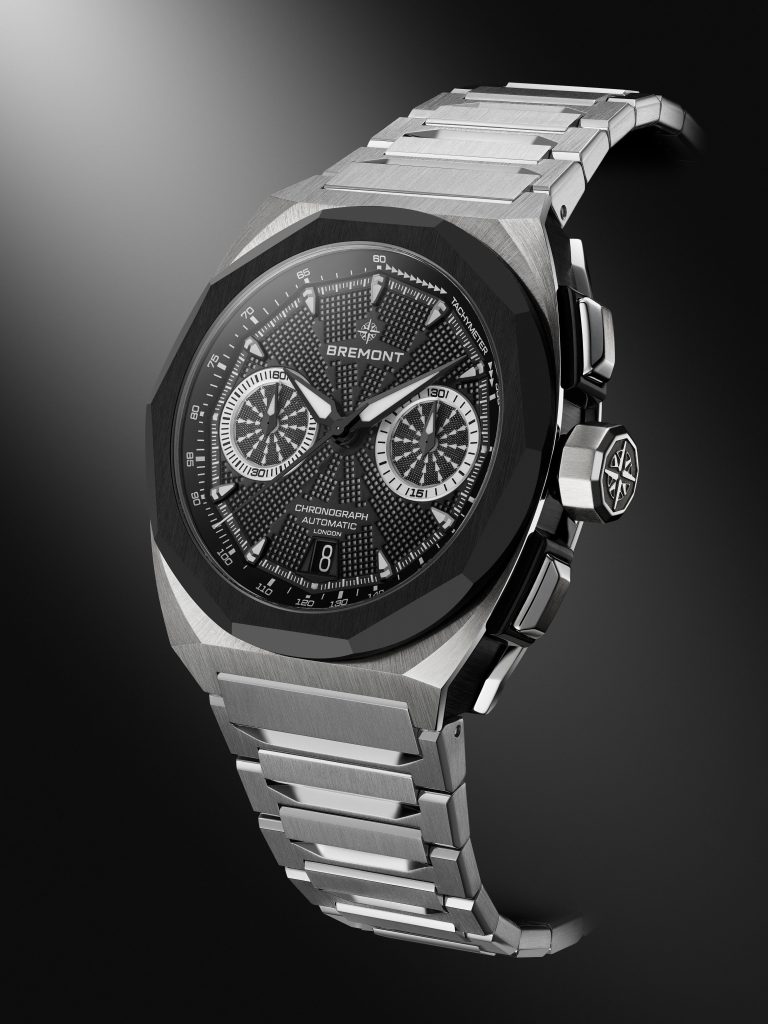 The 41mm case is a geometric take on Bremont’s signature “Trip-Tick” case architecture, in 904L steel – a material known for strong corrosion resistance and long-term durability – with a DLC-coated middle section and a decahedral black ceramic bezel. Designed to reference the illusion of movement through space, the dial glows from beneath, with a perforated black galvanic grid set over over a full blue-emission Super-LumiNova base.