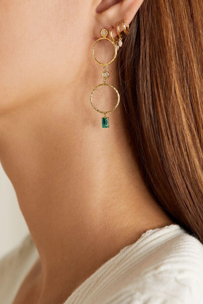 Product spotlight: These drop earrings are handcrafted from 18K gold and are hammered to enhance its shimmer and give off a rugged, lived-in feel. The pair is embellished with diamonds and a single seafoam-hued emerald each for an added sparkle.