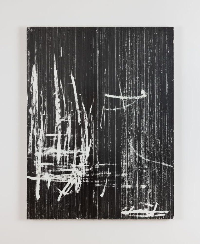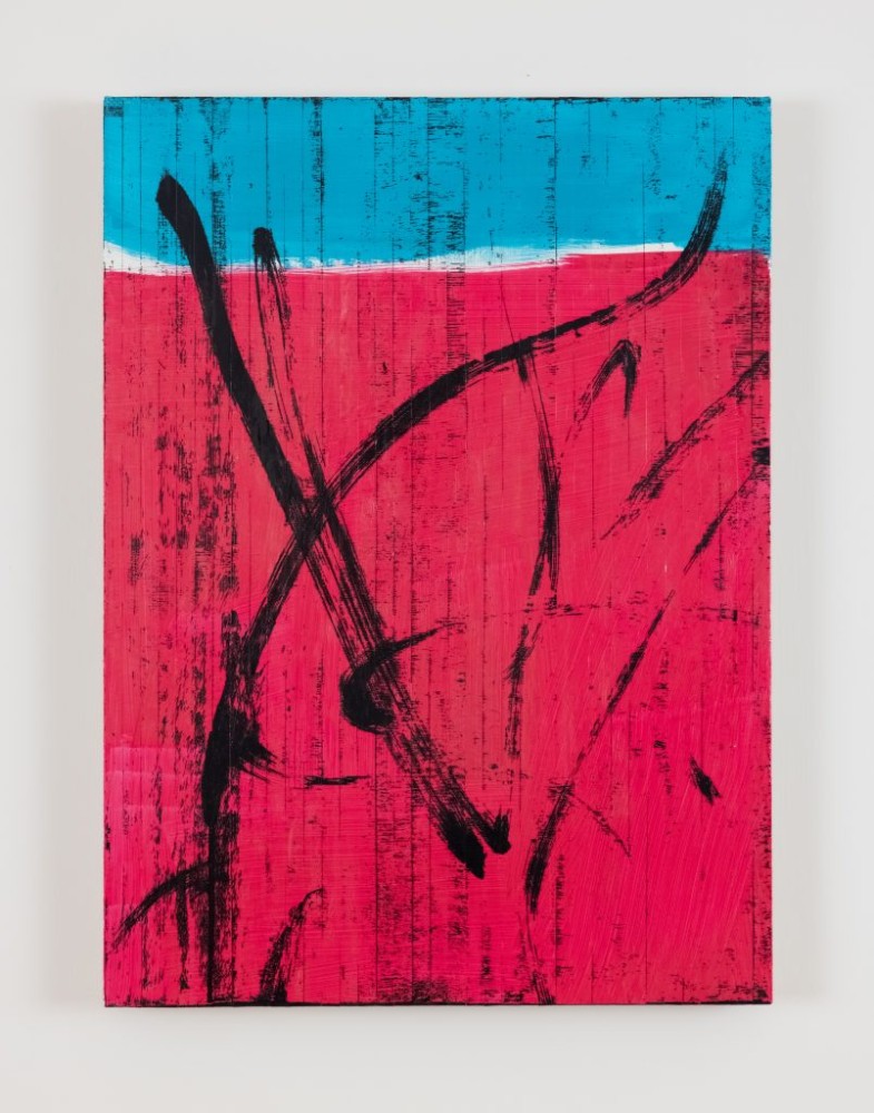 Continuing the trip down memory lane, Hildebrandt reminisces about his childhood game of sgraffito in a series of coloured paintings that use acrylic glue rather than his primary style of adhesive tape. In sgraffito, different coloured crayons are first applied to a surface, then covered in black and scraped off with a knife to reveal the colours once again. Incorporating his own twist, the artist used black VHS tapes dubbed from films to mimic the wax crayon. Though an unprecedented method to Hildebrandt, the paintings evoke bittersweet nostalgia as he sentimentally recalls, “[making colourful paintings] was always my mother’s wish.”