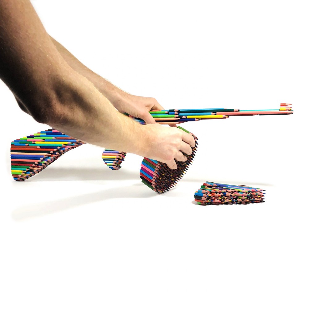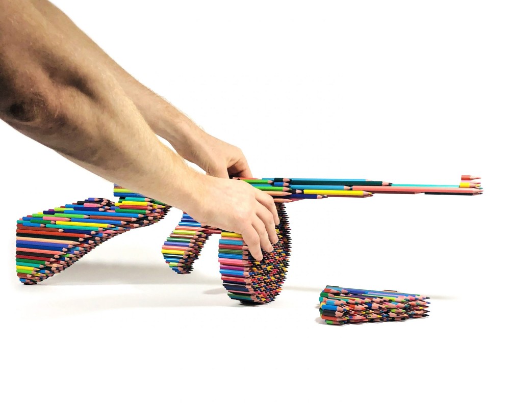 Imagine a well-stocked armoury replete with a Thompson submachine gun, Smith & Wesson revolver, Glock, M16 rifle, Remington 870 shotgun, MG 3 machine gun, Colt handgun, suicide vest and dynamite. But these aren’t ordinary weapons – they’re made from thousands of stacked colouring pencils in an array of vivid shades, enticing us to play with them.