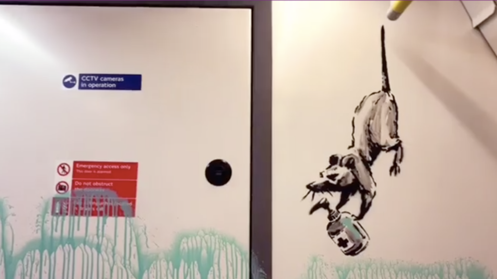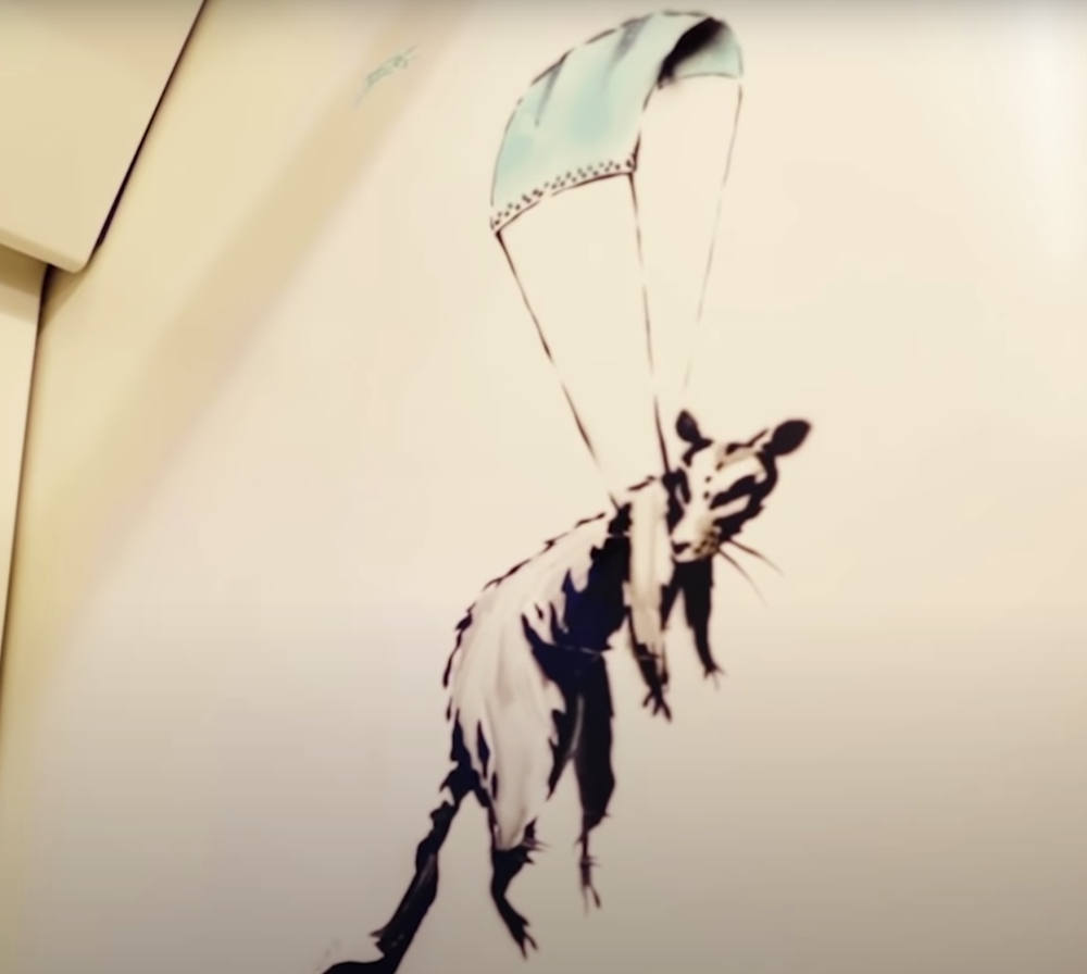 While the theme of the artwork may be masks, the real stars of the show are the stencilled rats using masks as parachutes, holding hand sanitisers and sneezing.