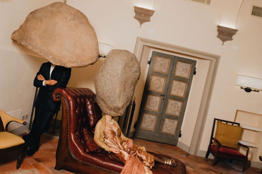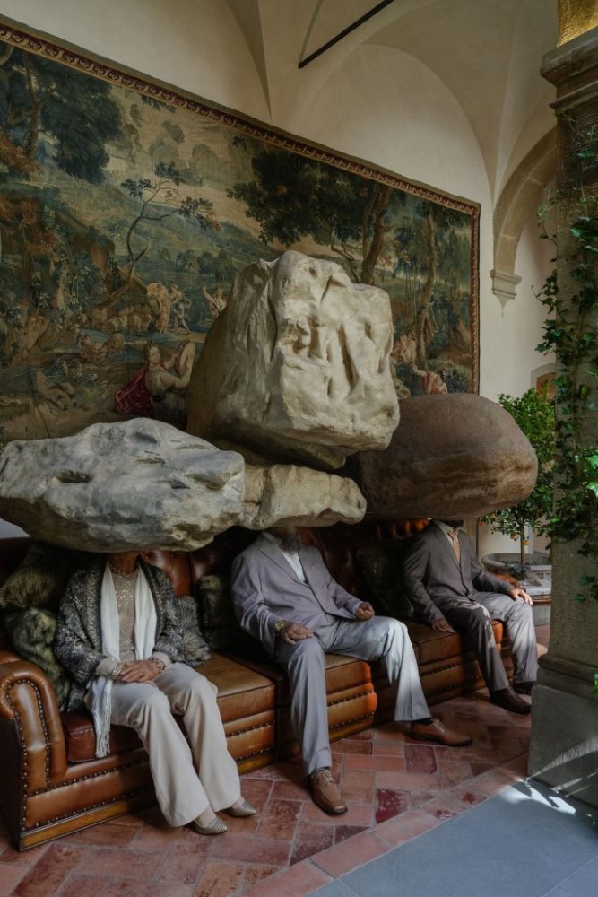 The sight of what seems to be wealthy people in a luxurious setting with rock heads that defy identification and communication speaks to our present-day impositions, in which wealth divisions and a preoccupation with social media blur and block our potential to connect. It’s something that the artists themselves note.