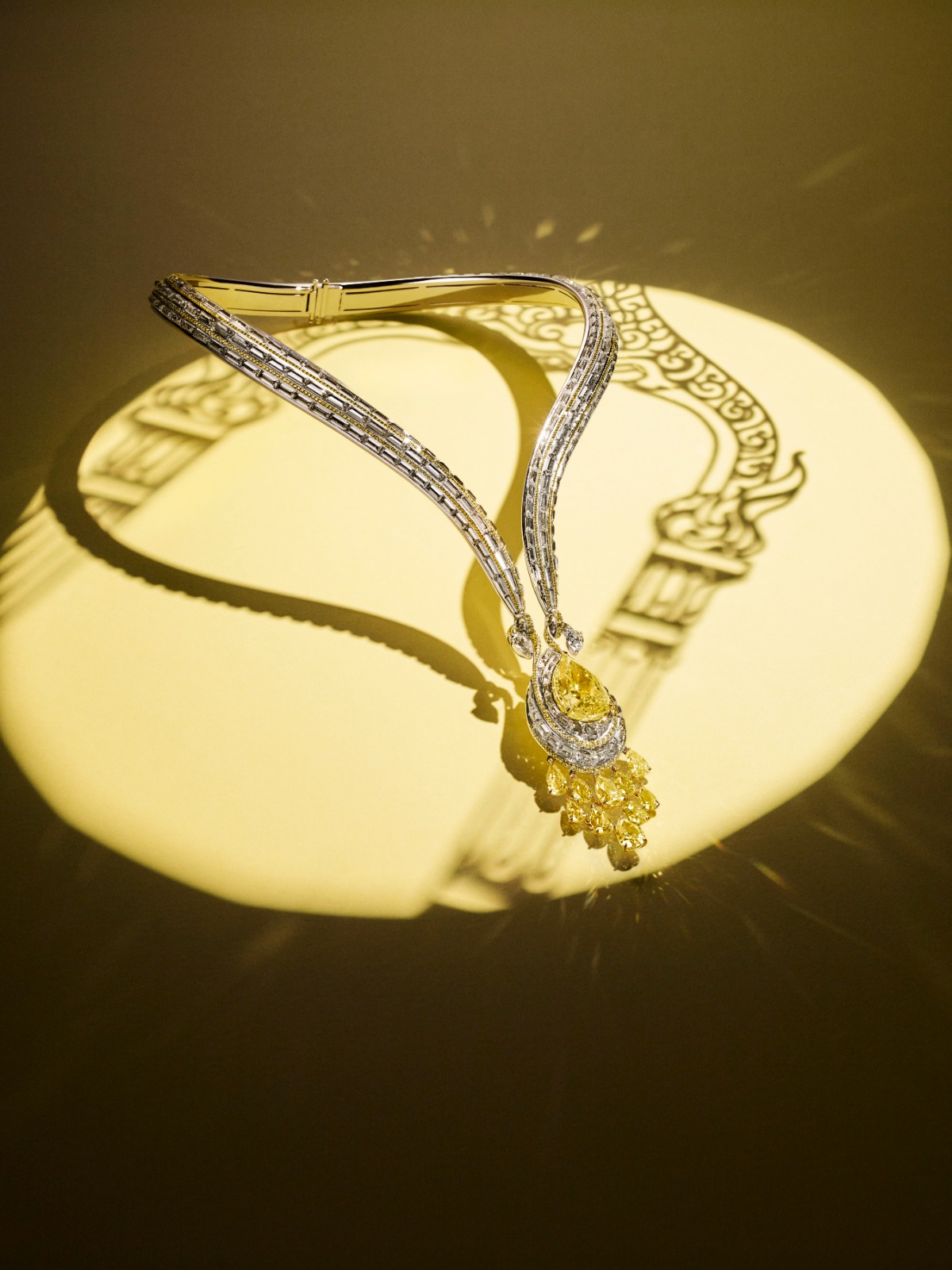Among the collection’s standout pieces, the “Shimmering Rays” ensemble dazzles with an exquisite array of fancy intense yellow and white diamonds, capturing the radiant allure of the palace itself. Masterfully crafted using an innovative invisible setting technique, this piece showcases sleek, uninterrupted lines that mirror the soaring columns and grandeur of the Grand Palace. At its heart is a pendant that reinterprets the legendary Naga, a dragon-like figure intricately integrated into the palace’s design, lending this modern masterpiece a captivating aura with an enchanting mystique.
