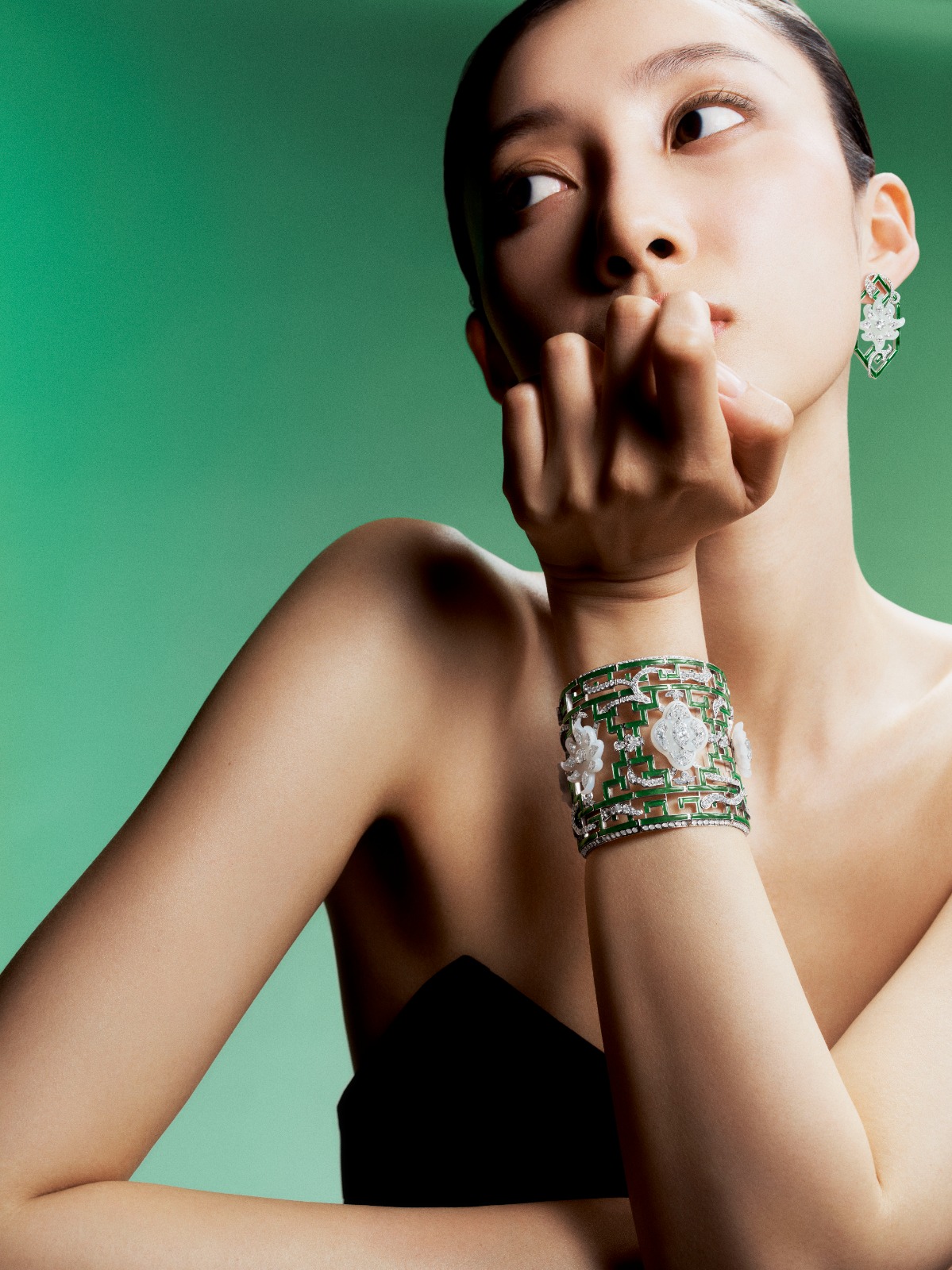 Complementing this exquisite piece is a jade and diamond cuff bracelet, where masterful marquetry captures the essence of dark wood lattices and the delicate allure of silk panels. Together, they epitomise a harmonious fusion of tradition and luxury, making a striking statement in the realm of contemporary high jewellery.