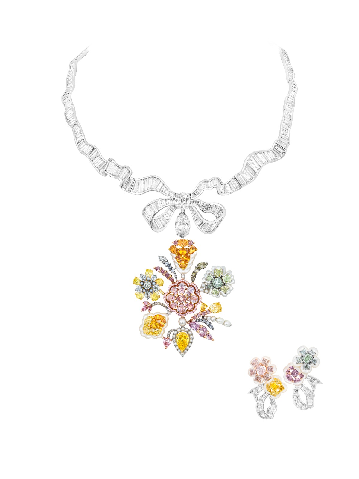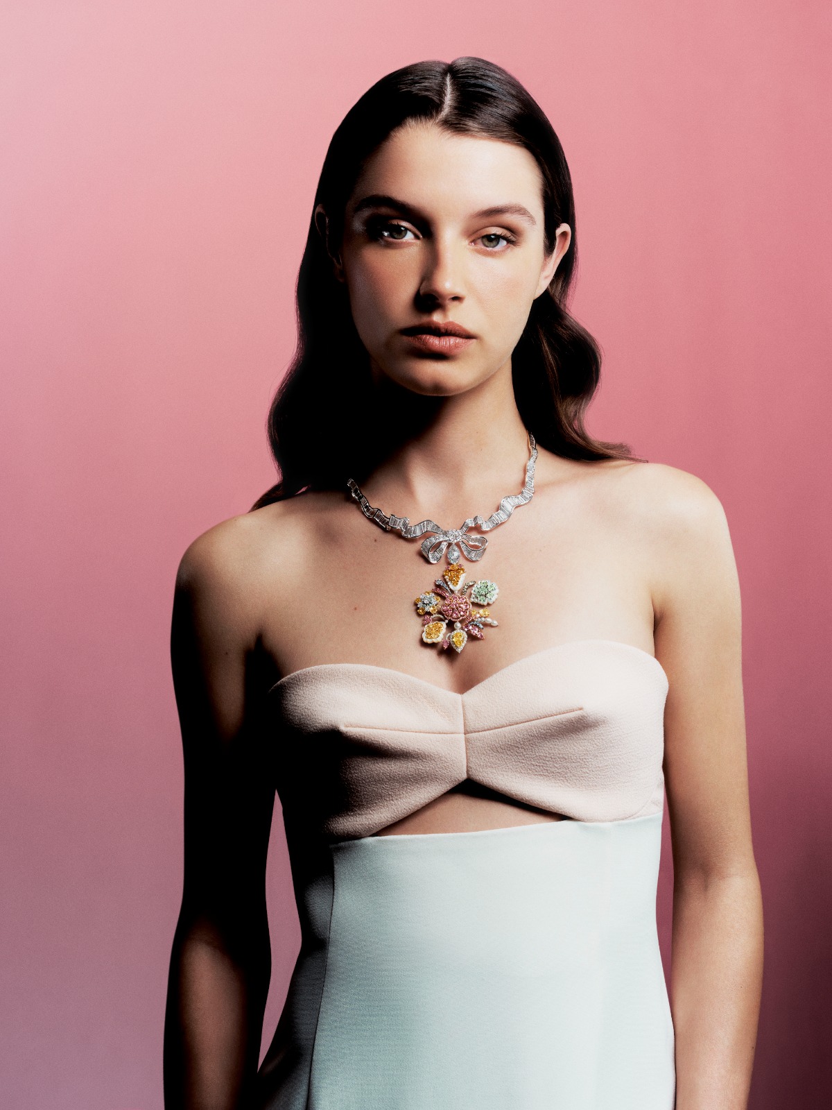 Introducing Belvedere Beauty, where elegance meets artistry. This exquisite necklace draws inspiration from the delicate frescoes adorning the palace and its enchanting gardens. A captivating “ribbon” crafted from shimmering baguette diamonds mirrors the graceful motion of a bow, while a beautifully rendered flower basket bursts with an array of multicoloured diamonds, celebrating nature’s vibrant palette.
