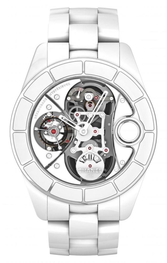 That same year, Chanel entrusted one of the most respected horologists, Giulio Papi, to design the J12 Rétrograde Mystérieuse. The unique design was offered in both high-resistance black and white ceramic with gold. It combined many of the world’s firsts, a tourbillon, digital minutes display, retrograde minutes hand, 10-day power reserve, and a retractable crown.