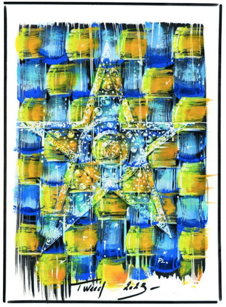 The dream, this time round, was to create tweed through the use of precious stones. The next room in the exhibition lays out the framework for this new vision. There are five chapters – stars, camellia, ribbons, a comet on a blue background, and the yellow sun and lion highlighted with flashes of red – with each representing a motif that is emblematic to the house and dear to its namesake.