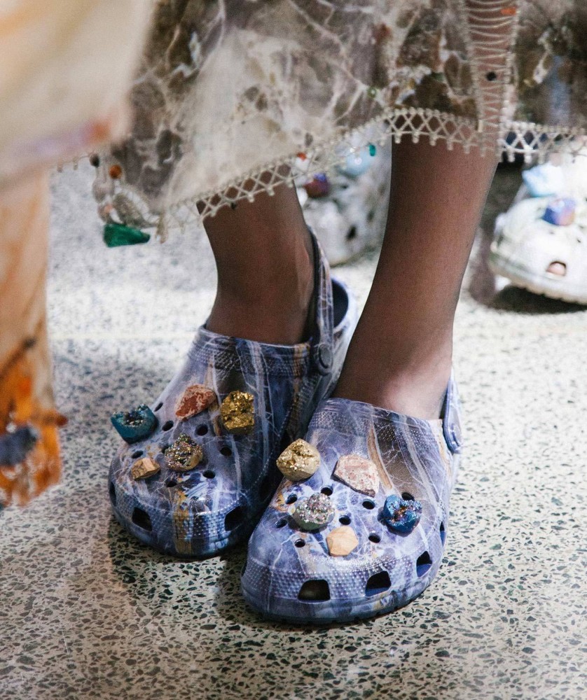 Christopher Kane even gave Crocs a high-fashion makeover by spotlighting them in his SS17 collection. The British designer debuted a marble version embellished with crystal jibbitz and styled it with metallic tie-dye dresses on the 2016 LFW runway.