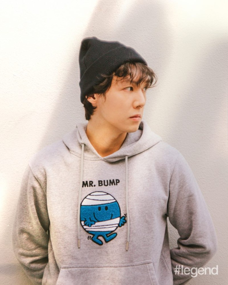 Jim Lee wears cotton sweatshirt with Mr. Men patch, blue jeans and woollen beanie With leather jacron label by Sandro