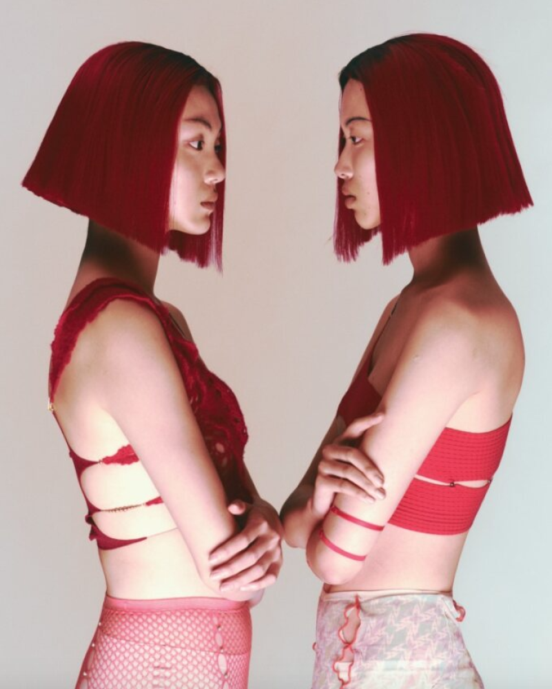 On Xiu Ling: Red asymmetric cutout top and star-print cutout tights _ Rui