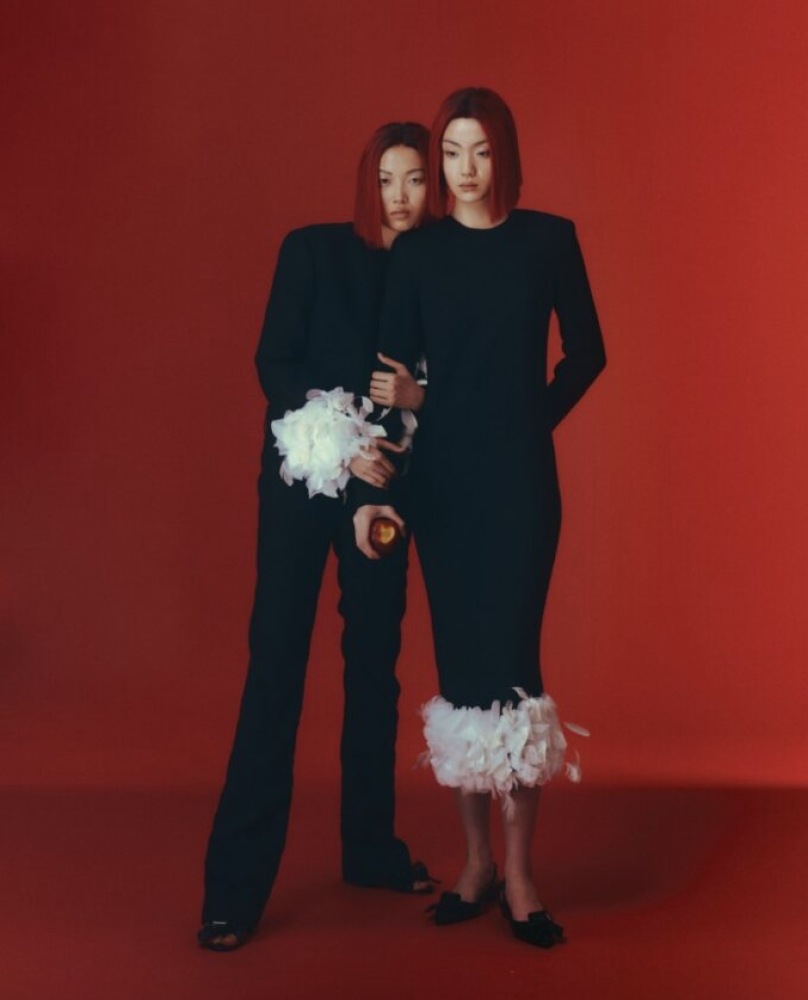 On Yan Zhen: Black top and trousers _ Balenciaga