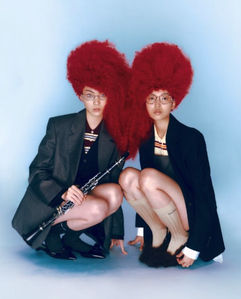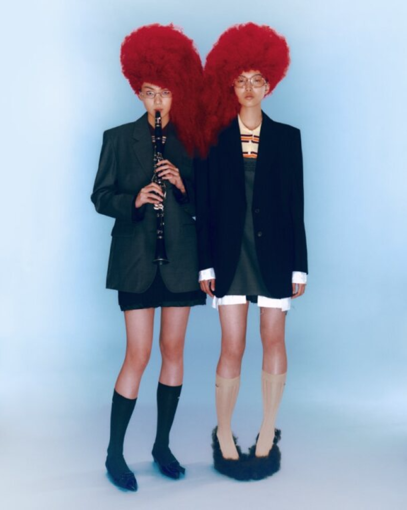 On Xiu Ling: Navy single-breasted pinstripe jacket, orange striped knit polo shirt, grey mini dress, beige knit socks and grey shearling heels _ Miu Miu; Tiara 02 glasses _ Gentle Monster x D’heygere