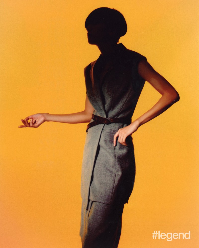 Right: Grey vest and skirt, and brown monogram belt by Louis Vuitton