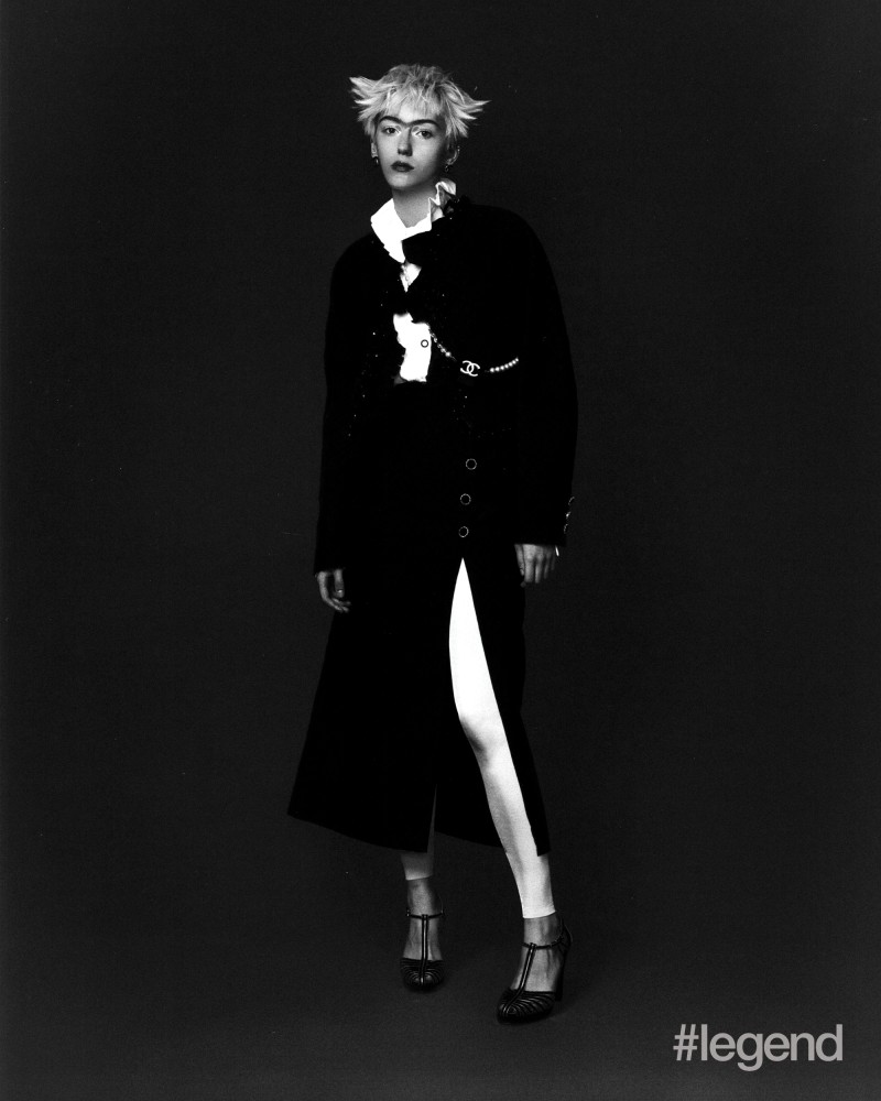 Right: White shirt, black collarless tweed jacket, black wraparound tweed skirt, silver metallic
