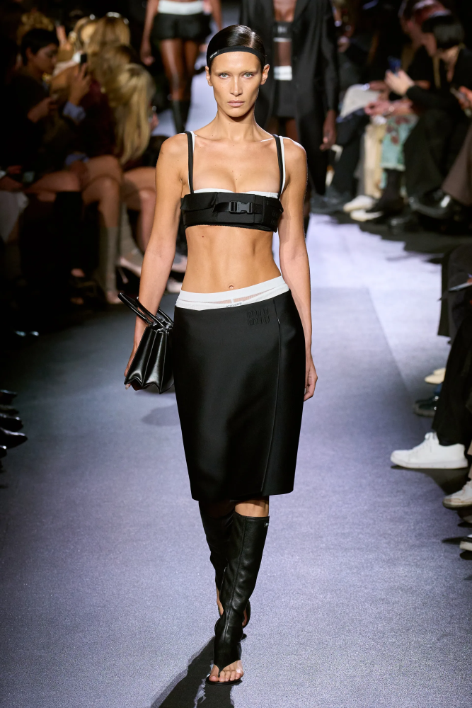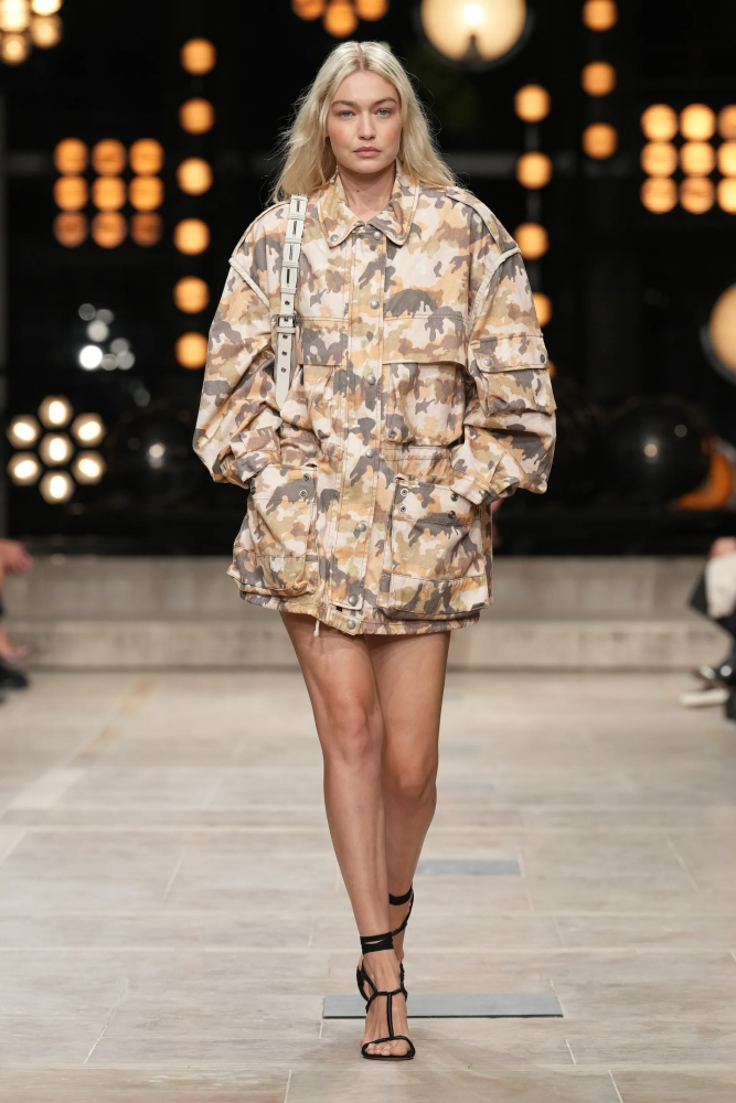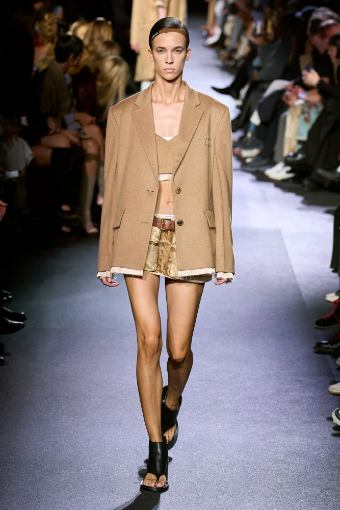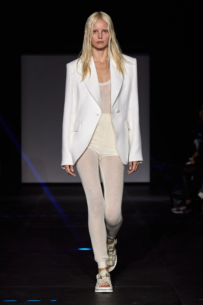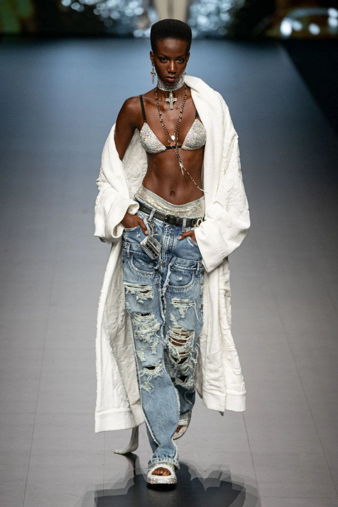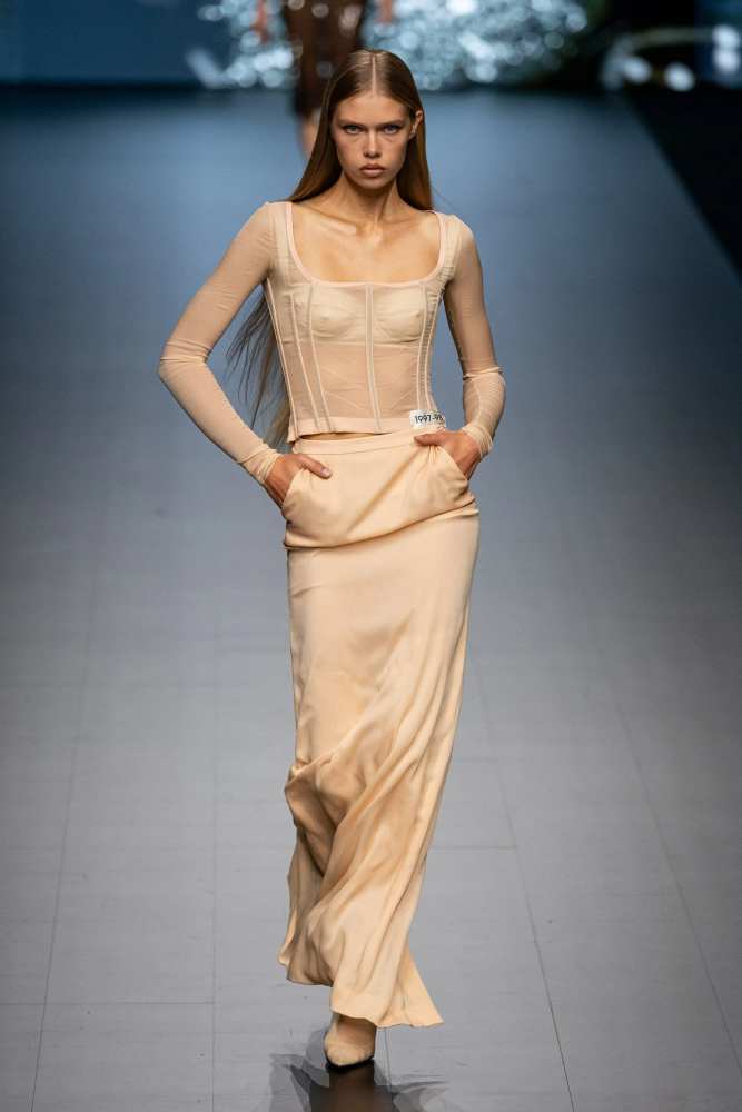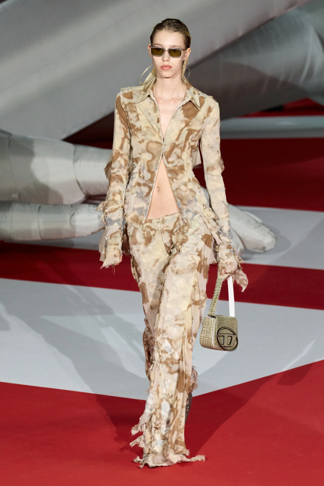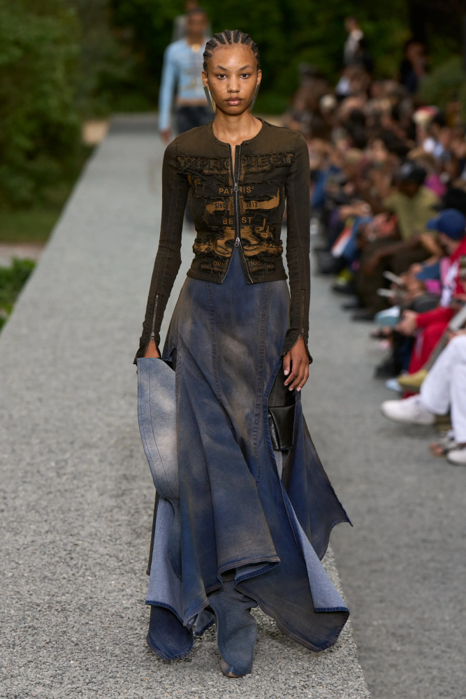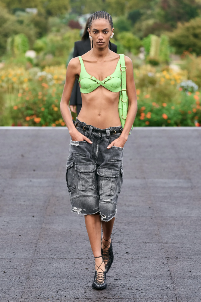 Glenn Martens has a particular recipe when it comes to Diesel: Pop, Utility, Denim and Artisanal. Corsets stitched with layered tulle, lace and organza; two-tone olive bomber jackets; racer- back or spaghetti-strap minidresses; and frayed logo tank tops all made the cut this season. Martens explained his understanding of new Y2K and retro fashion step by step. He also delivered a sustainable concept featuring recycled cotton and elastic fibres.