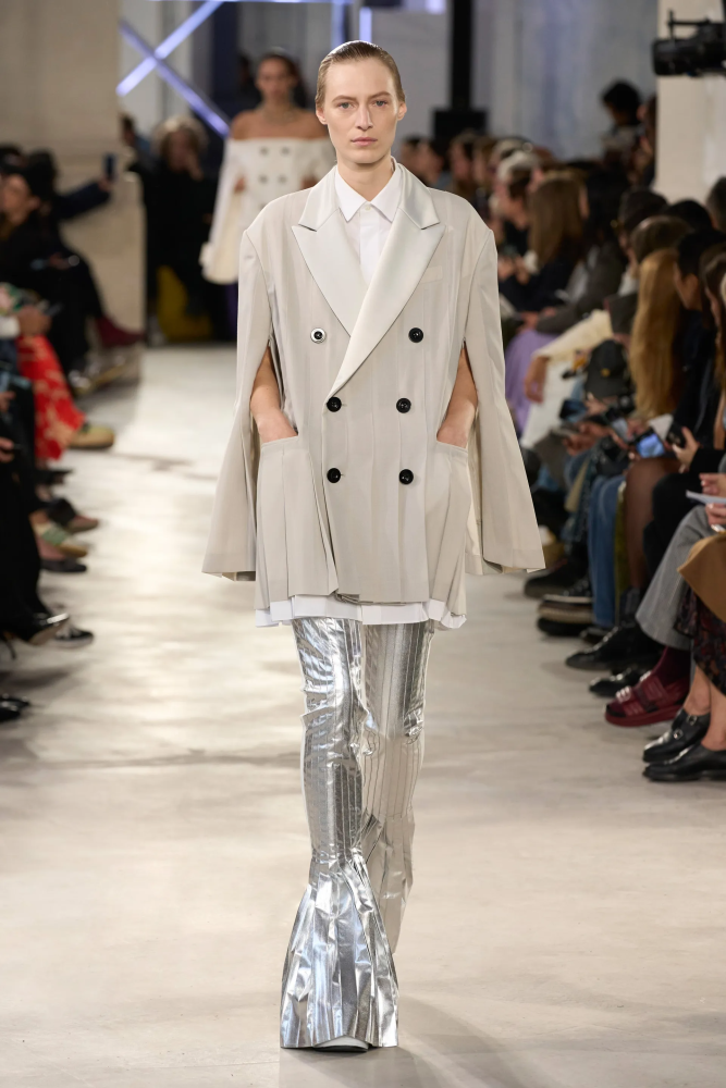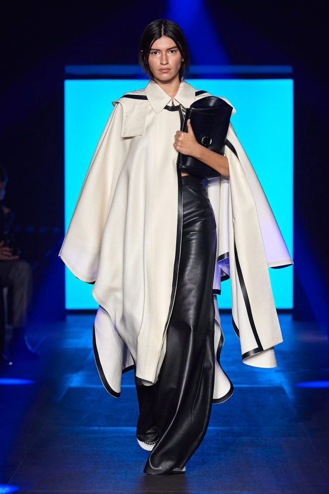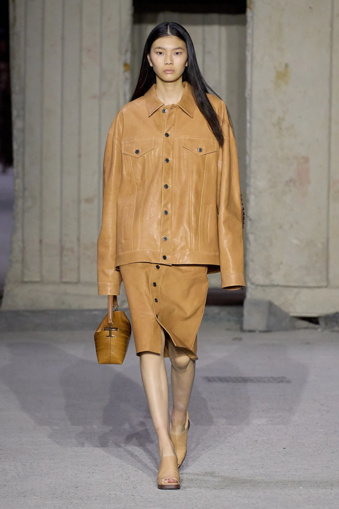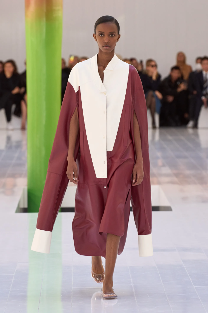 “The collection is about a contrast of characters on the go, invited to travel through Gaetano Pesce’s landscape. Here, two distinct worlds are juxtaposed, while our journey of craft in motion and quiet power continues,” Matthieu Blazy said of his second collection for the Italian luxury house. Every single piece, while appearing simple, was unexpectedly technical and luxurious, down to the “denim” and “flannel” that was actually made entirely of leather.