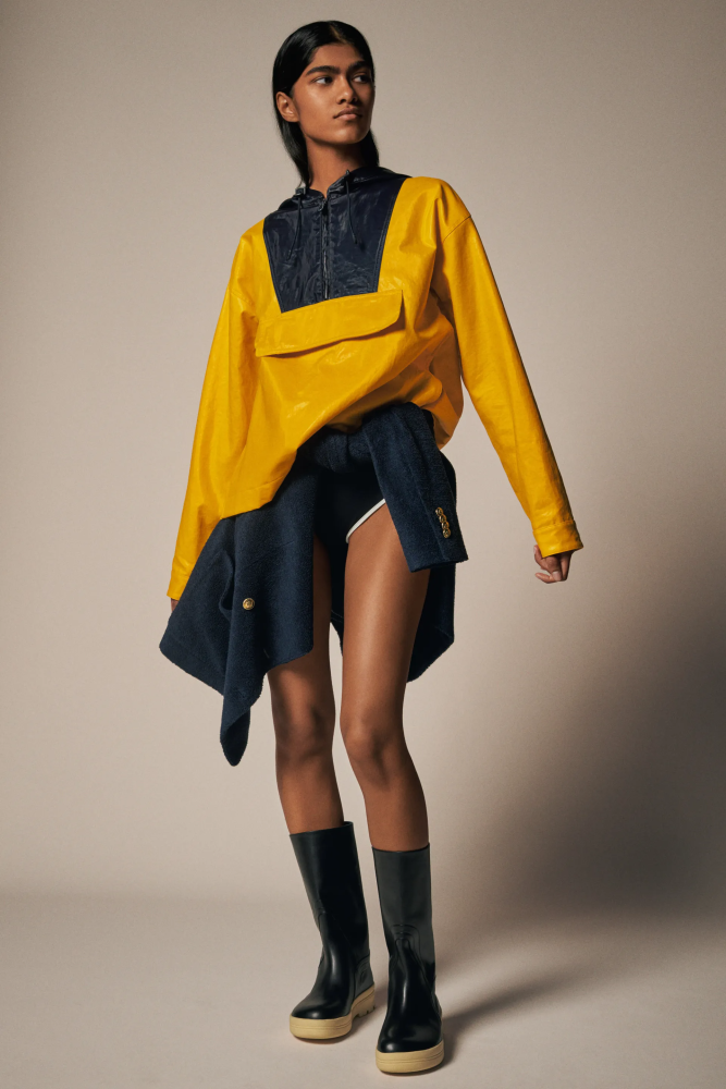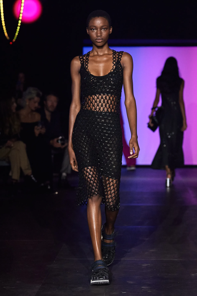 This season, Gabriela Hearst evoked an industrial rave while paying tribute to fusion energy. Replete with woven and crochet elements, loose beaded wire and frayed ends, the collection also took inspiration from factory workers’ uniforms and power plant machinery. Hearst used recycled cashmere, organic cotton, low-impact wool and more to reduce the brand’s carbon footprint.
