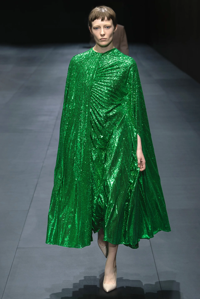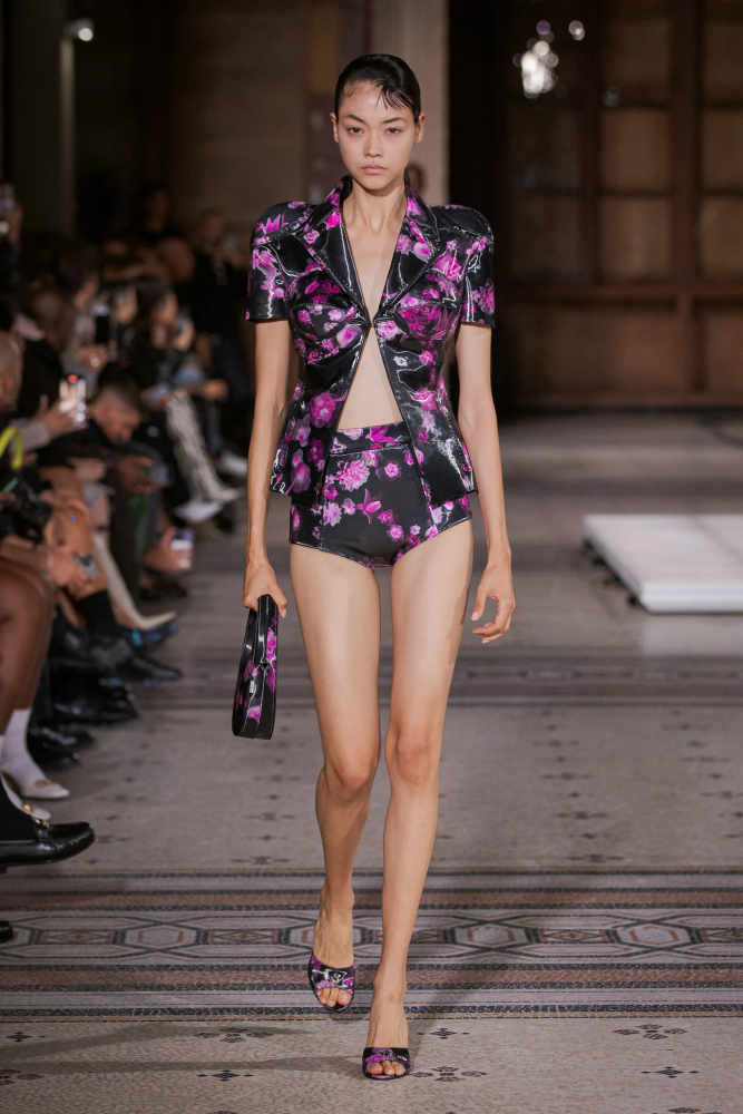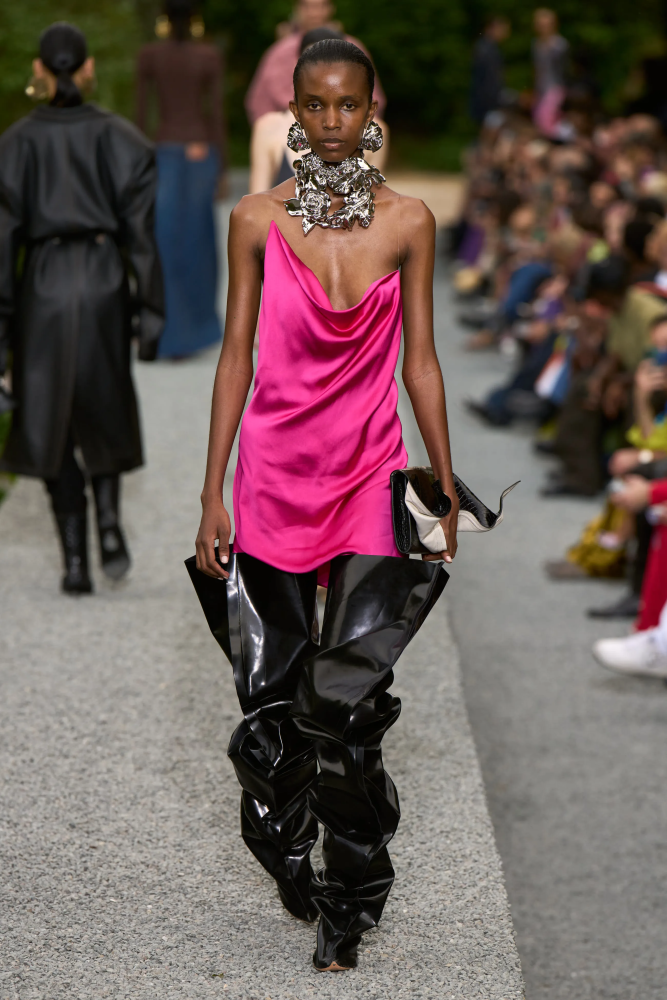 Jonathan Anderson chose to present “a blunt design statement, amplified through the act of reduction” in the form of tightened silhouettes, shrunken lengths, and enamelled metals and florals. The giant anthurium on stage amplified the inspiration of this collection – a product of nature that looks like an object of design. Standout looks included playful pumps with floral details and anthurium- shaped dresses and tops.