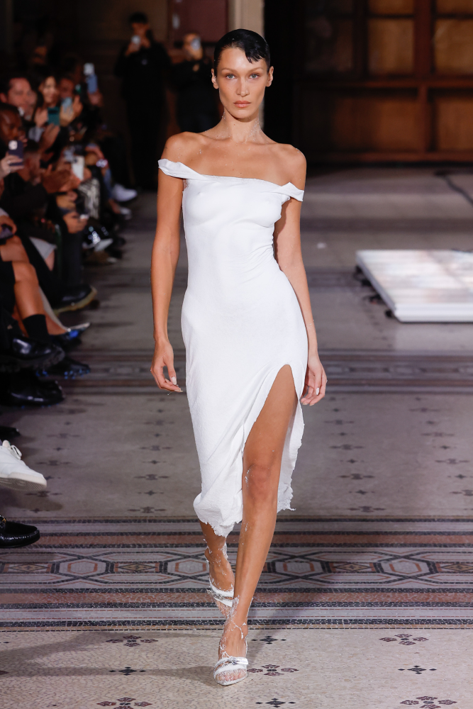 Coperni’s SS23 show will be comitted to the annals of history, after a trio of scientists used a spray- on liquid to apply a dress directly onto Bella Hadid’s body in a captivating piece of performance art. Elsewhere in the collection, metal stitching elements, deconstructed bra cups transformed into shoulder pads and suits with varying layers all served to interpret the sense of conflict and harmony when toughness and femininity collide.