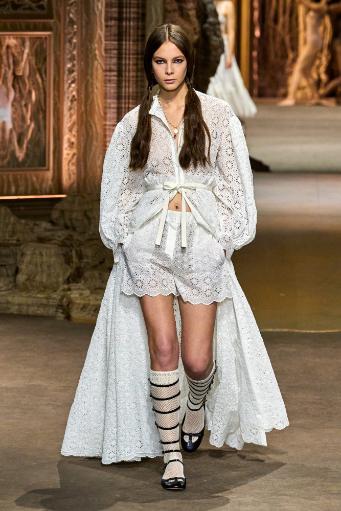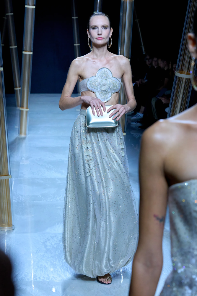 Maria Grazia Chiuri began her exploration of “magical territories” with a map of Paris from the luxury house’s archives, paying homage to fashion as an art of invention able to redefine the city over and over again. Key pieces included an updated corset with a quasi-geometric shape that framed the bust, raffia coats adorned with floral and bird motifs, and deepest black dresses contrasting with the purity of white shirts and skirts.