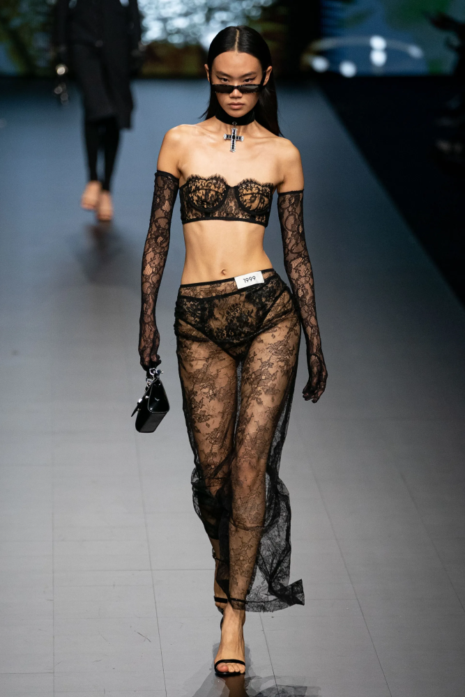 After postponing the show out of respect for the late Queen Elizabeth II, Riccardo Tisci presented his SS23 collection on a Monday between Milan and Paris Fashion Weeks. Inspired by the intricacies and eccentricities of British seaside society, Tisci created a goth-tastic collection of glittering swimwear paired with streetwear-style trench coats, big buttoned gilets and barely-there lace dresses.