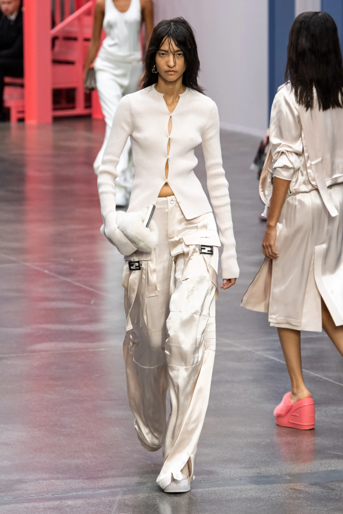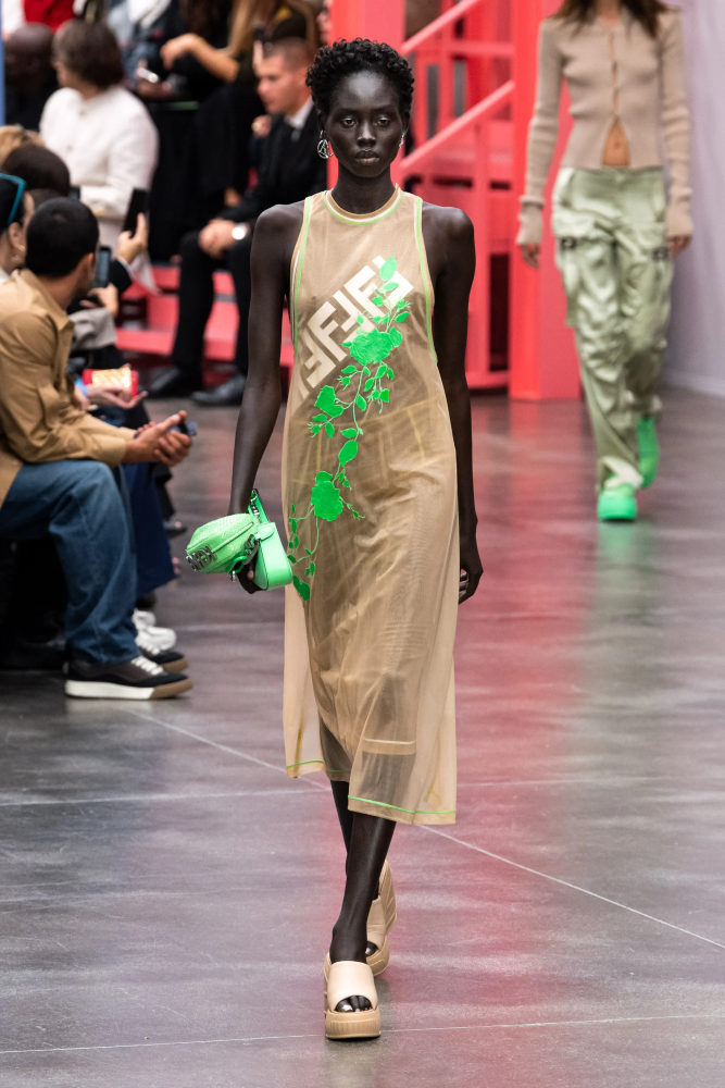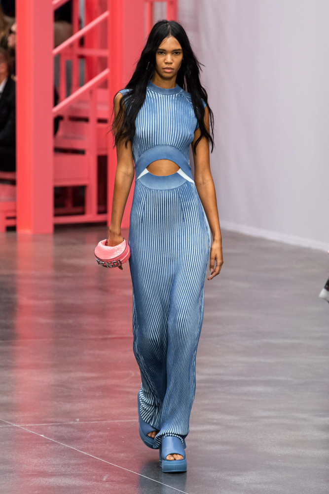 Kim Jones’s SS23 colour palette has been compared to that of a gelateria with its rich neutrals of cream, caramel, cappuccino and warm grey joined by pops of watermelon, pistachio and mint. His pieces, meanwhile, took inspiration from Fendi’s own archives and legacy of strong women in an exploration of “the notion of functional utility alongside femininity”. Laser-cut leather vests, sleek racerback dresses, obi-style belts and a delicate floral motif from 2000 made the collection one to remember.