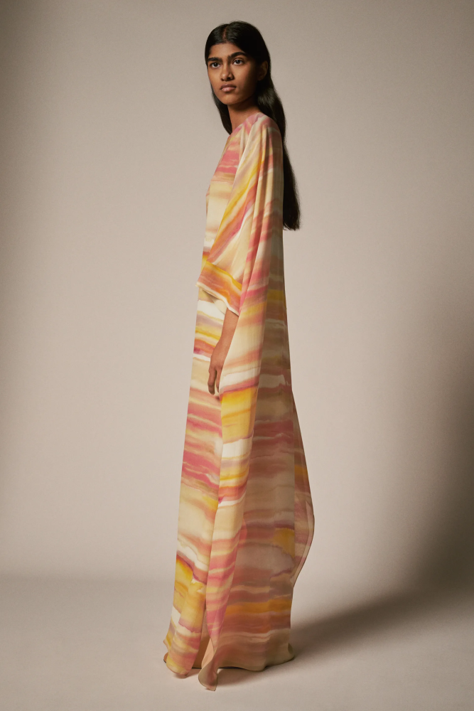 Titled Fil d’Or (Golden Thread), the legendary Italian’s SS23 collection was conceived as “a vision designed to soothe with dreamy tangibility”. Drawing from garments as diverse as the kurta and the cheongsam, Armani created a luxurious and feminine line-up of flowing gowns, zip-up shirting and loose-fitting duster jackets in extremely light and contemporary fabrics. Colours, meanwhile, shifted from golden neutrals such as sand to rich hues of purple and ink blue.
