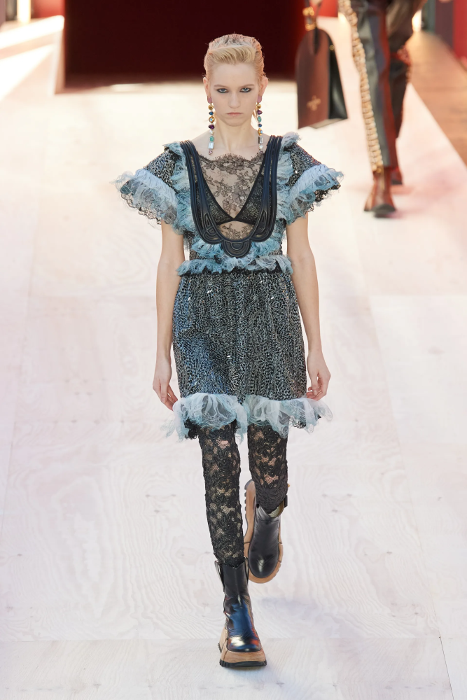 From the supersized zipper on Squid Game actress HoYeon Jung’s opening look to the disproportionate bags and accessories that followed, Nicolas Ghesquière’s SS23 collection was a rollicking play of proportions in which “zippers and snaps are outsized, clasps become belt buckles, and a scrap of leather is turned into an outfit”. Femininity was also at the forefront as seen in swingy dresses and lace ensembles.