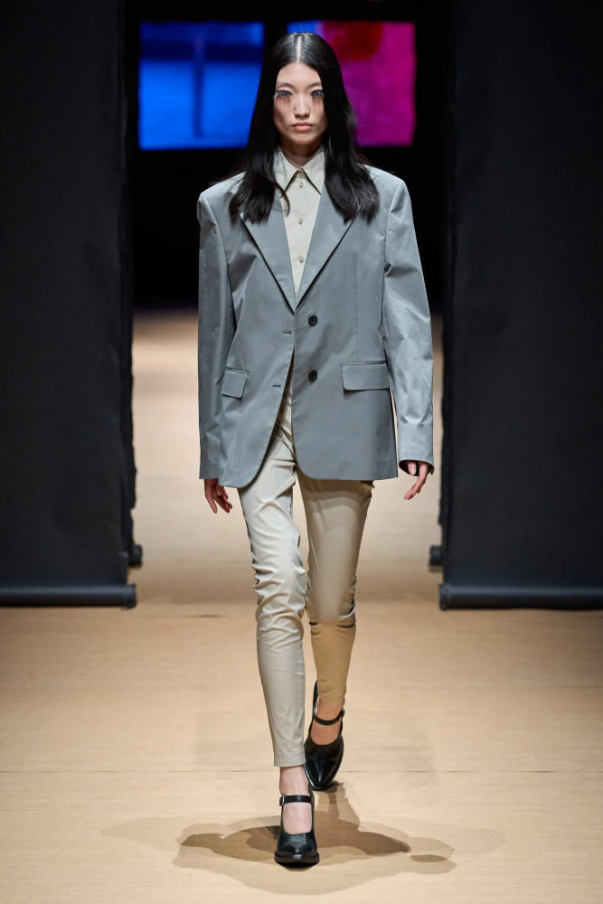 Simons presented a series of “reflections, refractions and observations” for SS23. Several pieces in the collection were made of a paper-based fabric to mirror the décor of the show space (a black paper panopticon) while others signified shifting realities in the fusion of day and evening styles and loungewear and outerwear elements.