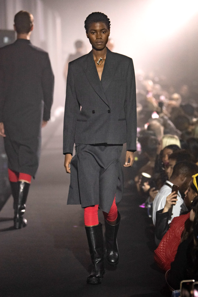 Glenn Martens continued his playful approach to design with Y/Project’s SS23 collection, featuring unexpected silhouettes and trompe-l’oeil prints inspired by his second collaboration with Jean Paul Gaultier. Standout pieces included supersized thigh-high boots, deconstructed dresses with detachable panels, and printed tops that resembled jeans.