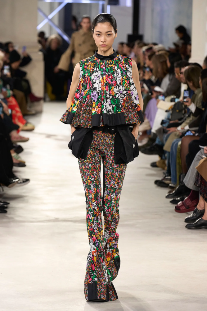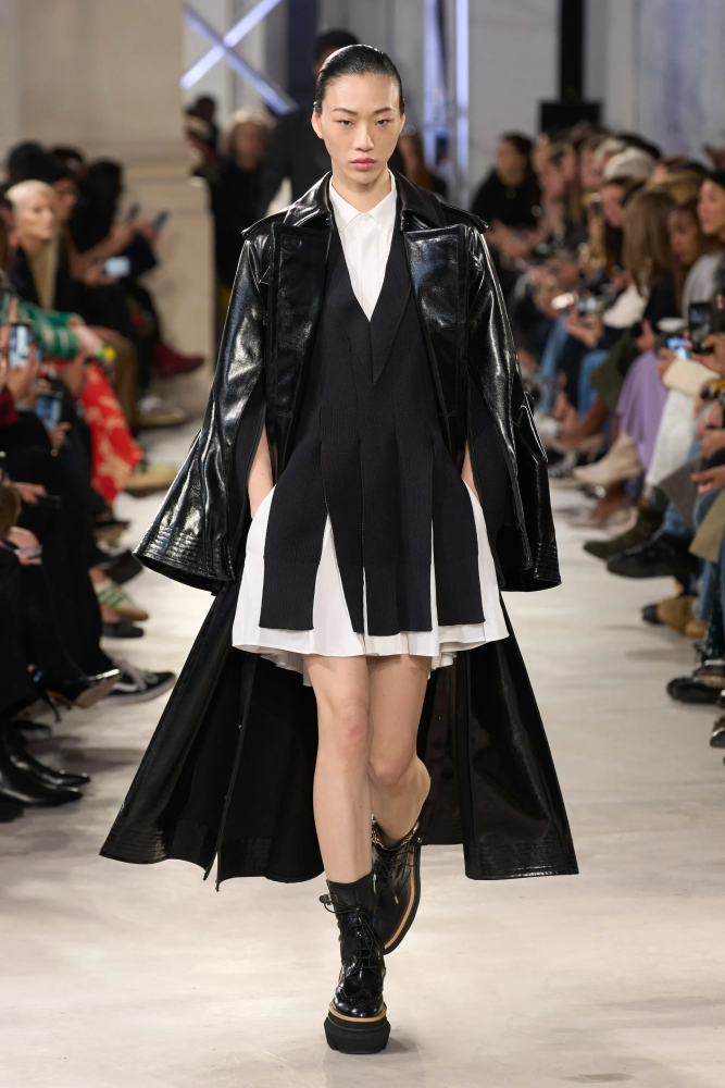 Famous for her hybrid design language, Chitose Abe kicked off Sacai’s SS23 show with a satin-trimmed blazer transformed into a pleated cape and paired with pleated and spliced bottoms. The rest of the collection followed suit, with modern tailoring meeting street-style influence in an exuberant expression of joy, hope and optimism. Of particular note were the pleated leather garments, slitted tracksuits and coats, and nylon trench coats reimagined as dresses, corsets and miniskirts.