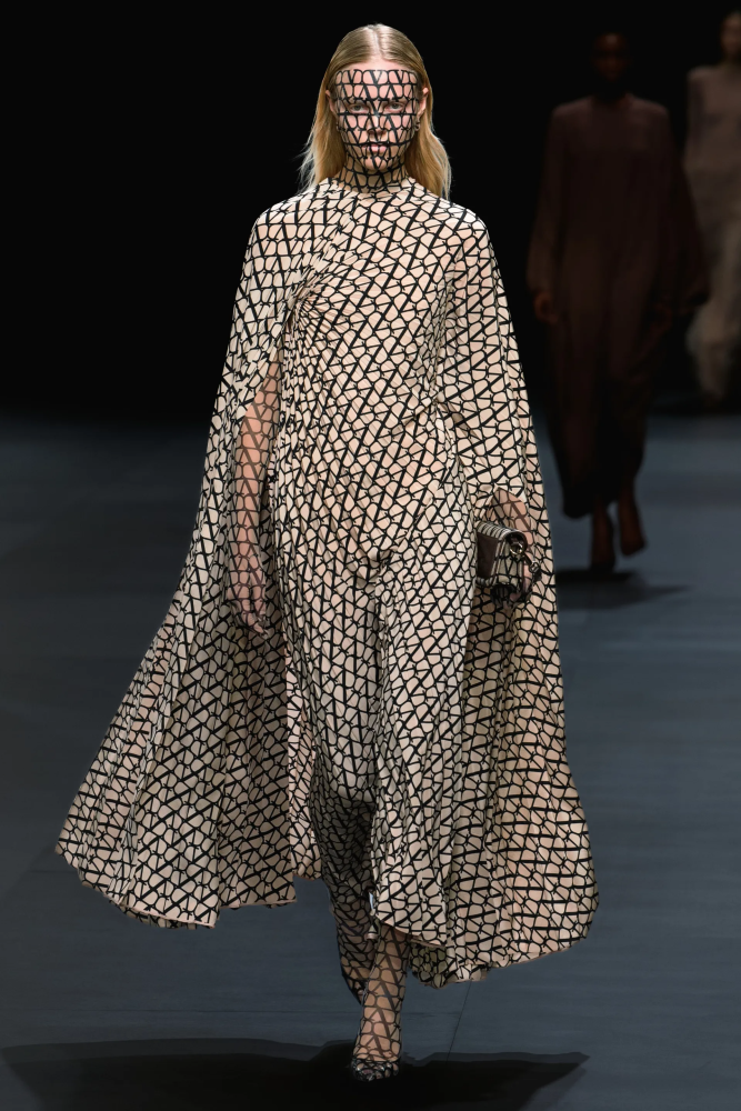 Set against a background of stark black, “Unboxing Valentino” drew on the concept of “pureness as a conscious synthesis, the intentional removal of what exceeds”. In reducing unnecessary construction, Pierpaolo Piccioli presented a striking series of suits, capes, dazzling dresses and a fully embellished monogram number that