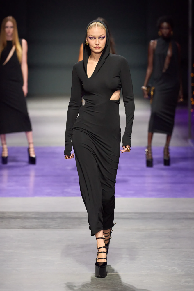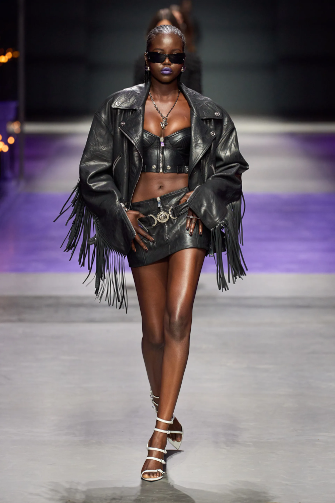 Created around the idea of a dark gothic goddess, Donatella Versace’s SS23 collection was a celebration of high glamour and hard-edged design. Starting with a palette of all black, the show continued with jolts of purple and electric fuchsia in low-slung belts, satin miniskirts, flared leather pants and seemingly endless fringe. The Y2K aesthetic came full circle when Paris Hilton closed the show in hot pink fingerless gloves.