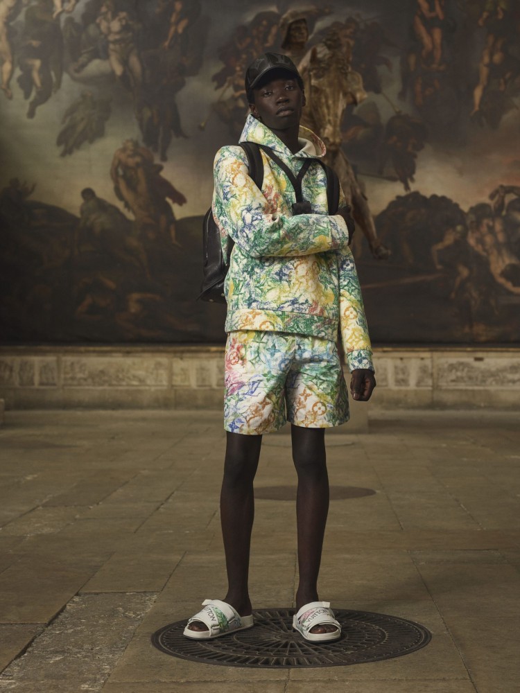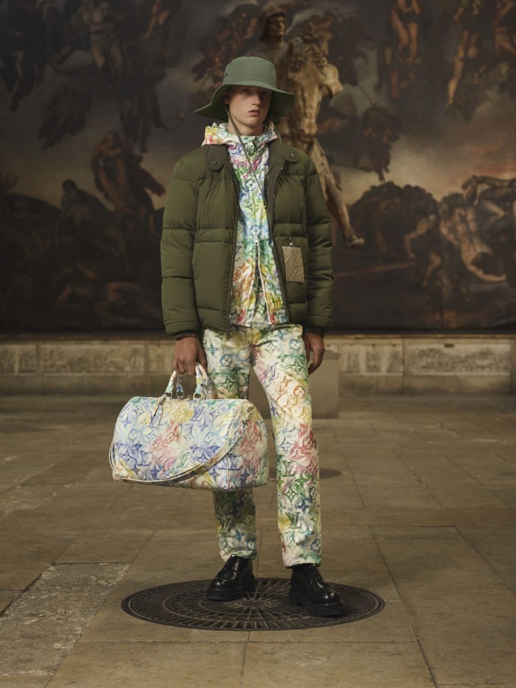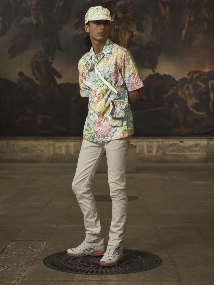 On the opposite end of the spectrum, a rainbow crayon monogram print stencilled from a debossed LV logo lands on spring-appropriate button-ups and trousers. The multi-colour toile pastel monogram also features on the brand’s beloved Keepall and smaller goods.
