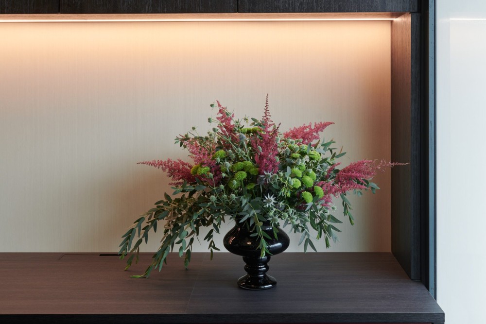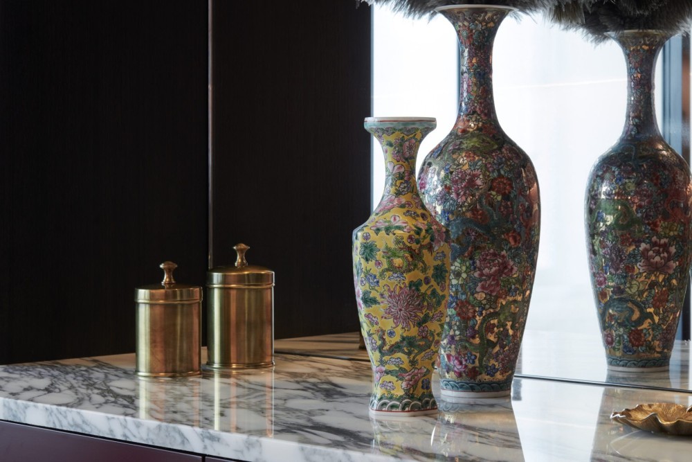 Thinking about contrasts, such as new and old, bright and dark, big and small, can also liven up a space. “Infuse old with new and mix and match,” says Li. “The variety of adding texture, materiality and colourful tones adds warmth to a space.” She references her own personal collection of vintage collectables, such as Chinese chinoiserie vases and an ostrich feather duster, which she placed on empty shelves as decoration to add character and texture to the space’s interior design.