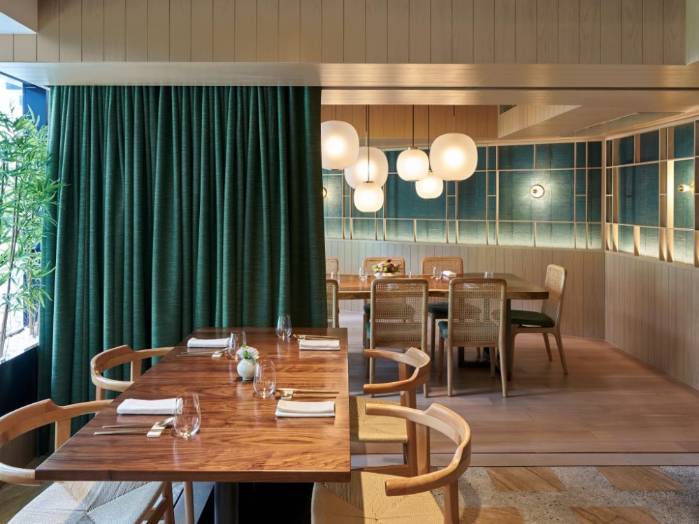 “Material-wise, the stone and timbers used [in Hansik Goo] are related to the traditional Korean home,” the designer says. “The tiling, green fabrics and blue tiles were more about bringing an abstract concept of nature, like the sky and vegetation, into the space using materials and colour.”
