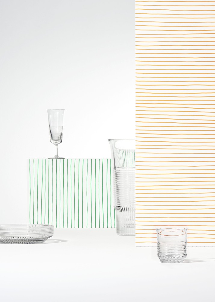 When it comes to making crystal – typically a more formal material representative of class and quality – casual, the keywords are functionality and simplicity. The clear-cut lines of Charpin’s design, which came to be the unifying element of the collection after a trial-and-error process that confirmed its malleability to adapt to different shapes and sizes, highlight the geometry of each silhouette. Vertical lines are etched into the lower parts to elevate the forms, while horizontal lines adorn the upper parts of each piece.