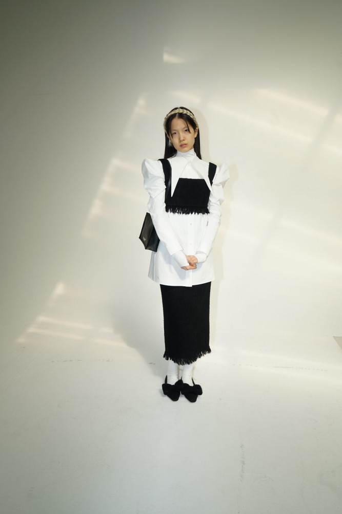 I like to give big contrasts in my collections with conceptual pieces and classic silhouettes because it’s more fun for me to develop. And this unexpected harmony gives a poetic feeling and creates a story. The combination of the school uniform look with the extraordinary pieces can represent my childhood play, which was free with no rules and just exciting.
