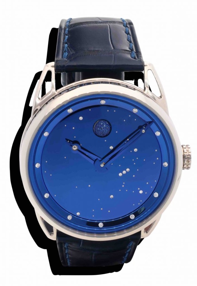 De Bethune has, since its inception in 2002, been an impressive mix of traditional watchmaking complemented by modern cutting-edge movements and avant-garde designs. This jewel (excuse the pun) in my collection is a mix of haute joaillerie and horology. Encased in a wearable 40mm case with DB’s signature hollow lugs is a mirror polished fired blue titanium dial adorned with beautiful white gold and diamonds to mimic the cosmic Geneva sky. What’s more impressive is a rotating 3D spherical moon phase located at 12 in palladium and fired blue steel, encrusted with 44 diamonds and 44 blue sapphires with accuracy up to 122 years. And, last but not least, the case band is further adorned with 61 stunning baguette- cut blue sapphires that beautifully complement the dial and overall aesthetics